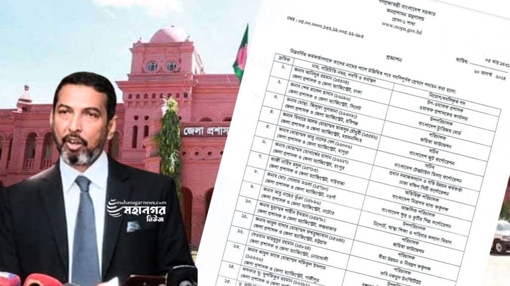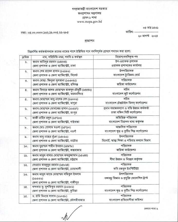 এর মধ্যে প্রথম প্রজ্ঞাপনে ঢাকা, সিলেট, হবিগঞ্জ, ময়মনসিংহ, মাগুরা, রংপুর, গাইবান্ধা, নওগাঁ, নাটোর, কক্সবাজার, চট্টগ্রাম, নোয়াখালী, গাজীপুর, কুমিল্লা, মৌলভীবাজার, খুলনা ও গোপালগঞ্জের ডিসিকে প্রত্যাহার করার কথা জানানো হয়েছে।