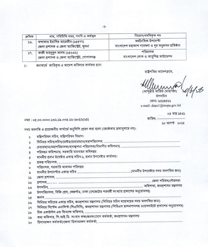 দ্বিতীয় প্রজ্ঞাপনে ফরিদপুর, শেরপুর, কুষ্টিয়া, ঝিনাইদহ, পাবনা, বগুড়া, জয়পুরহাট ও চাঁদপুরের ডিসিকে প্রত্যাহার করার কথা বলা হয়।