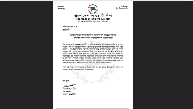 আজ রোববার (২৫ আগস্ট) বাংলাদেশ আওয়ামী লীগের দপ্তর সম্পাদক বিপ্লব বড়ুয়ার সই করা এক বিজ্ঞপ্তিতে তিনি এ কথা বলেন। বিজ্ঞপ্তিটি ফেসবুকে দলটির ভেরিফায়েড পেজে দেওয়া হয়েছে।