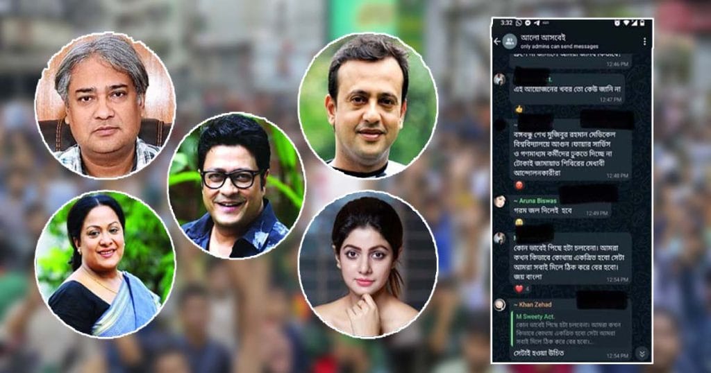 সম্প্রতি সামাজিক যোগাযোগ মাধ্যমে ‘আলো আসবেই’ নামক সেই হোয়াটসঅ্যাপ গ্রুপের কিছু স্ক্রিনশট ফাঁস হয়েছে। যেখানে দেখা গেছে, আন্দোলন চলাকালীন ছাত্রদের নিয়ে বিভিন্ন পরিকল্পনার কথা বলছেন শোবিজেরই কয়েকজন।