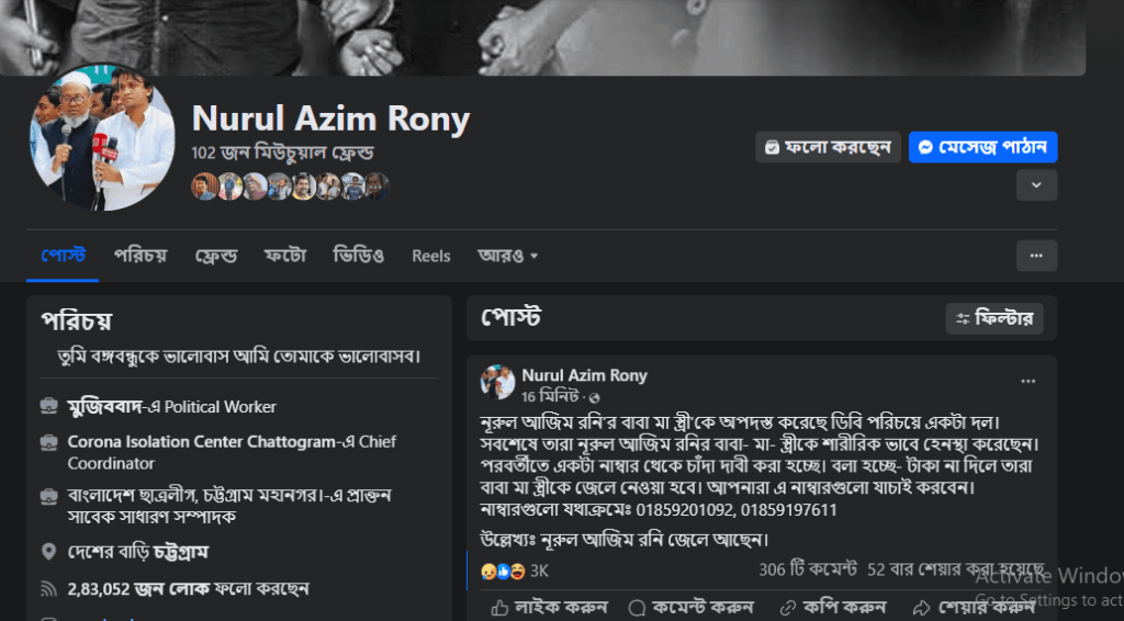 পোস্টে এও উল্লেখ করা হয়েছে, নুরুল আজিম রনি বর্তমানে জেলে আছেন।