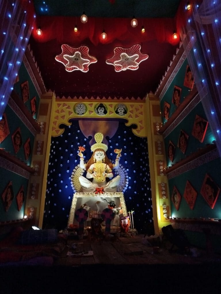 মণ্ডপ সাজসজ্জায় ছিল চিত্রকল্প ইভেন্ট, মৃৎশিল্পী সূর্যদাশ এবং ডেকোরেটার্স মানিক।